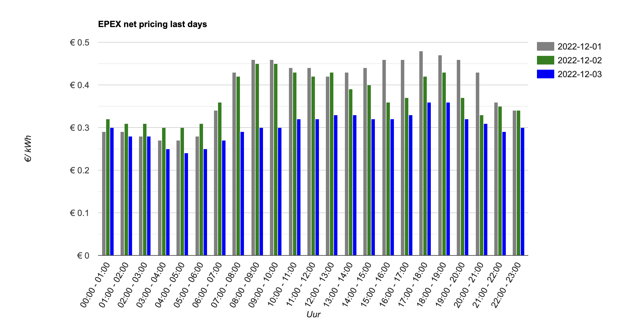 In het bovenstaande voorbeeld zien we de piekprijs van 2 december (groene balk) tussen 8 uur 's ochtends en 10 uur 's ochtends, beide van ongeveer € 0,45 per kWh. Deze prijs is exclusief BTW en exclusief transport en andere regulerende belastingen die specifiek zijn voor elk land en in sommige landen zelfs per regio.